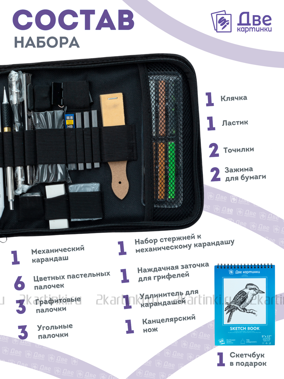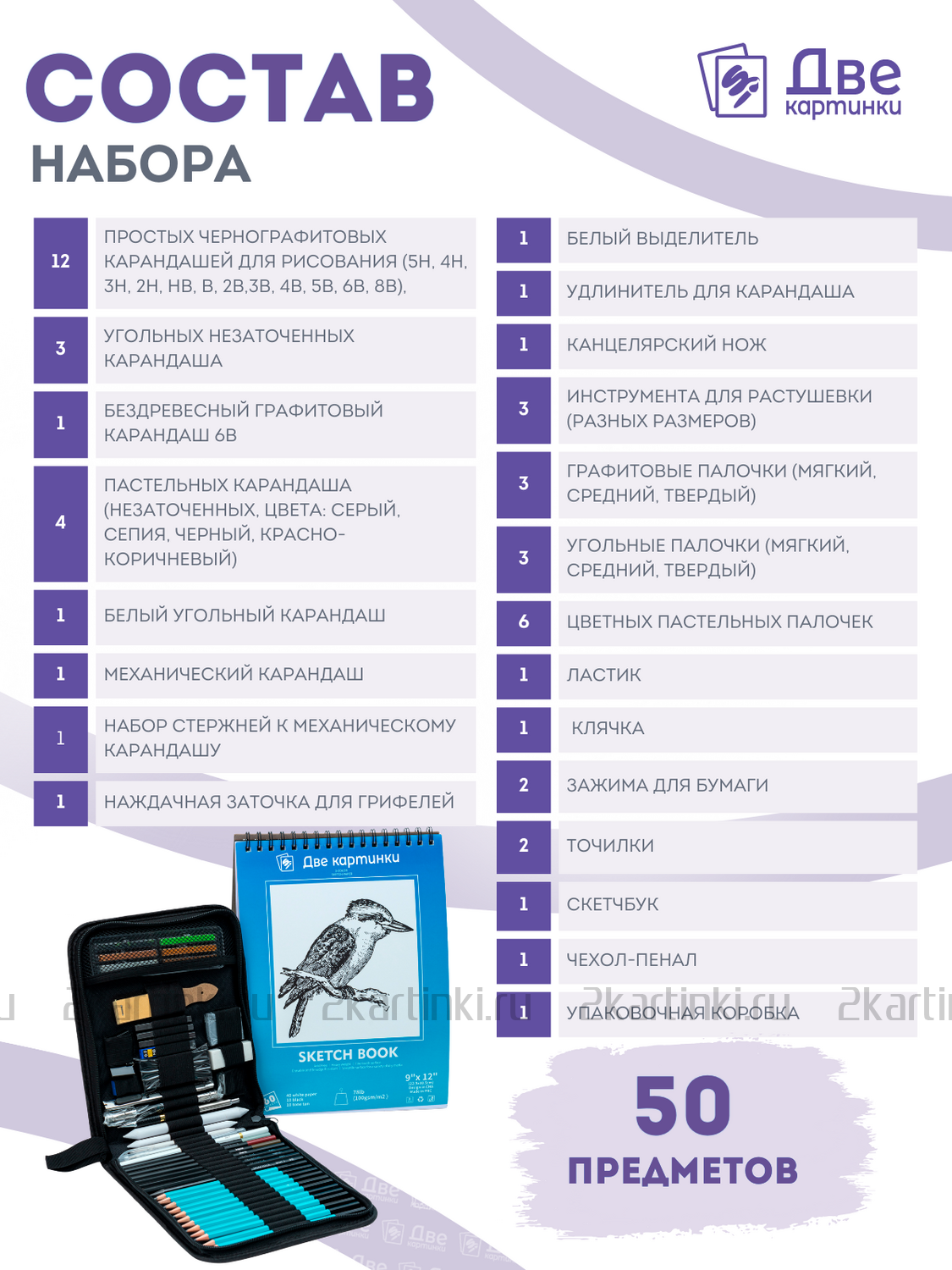 «Коробка 12 шт.: Набор для скетчинга в чехле: карандаши, грифели (50 предметов)»